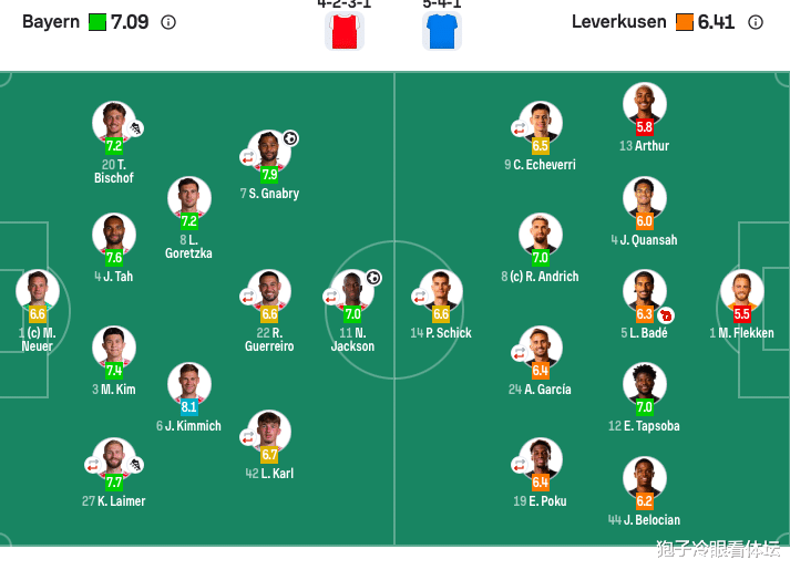 拜仁首发:1-诺伊尔、4-塔、3-金玟哉、22-格雷罗(79’45-帕夫洛维奇)、20-比朔夫、27-莱默尔(75’23-博伊)、8-格雷茨卡、6-基米希、7-格纳布里(60’17-奥利塞)、42-伦纳特·卡尔(60’14-迪亚斯)、11-杰克逊(60’9-凯恩)。