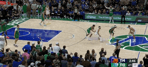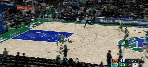 太阳虽然名义上只有吉莱斯皮是组织后卫,但一直打着drive&kick的人人持球突破分球耐心寻找机会的进攻。古德温和伊戈达罗在一侧掩护发起,突破后传给底角吉莱斯皮,后者晃起拉塞尔二次分球阿伦三分命中。