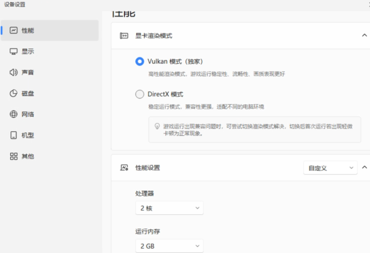 性能直接自定义2核2G,当然了电脑配置好一点的话使用预设的3核3G或者4核的更好哈。
