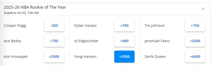 最佳新秀赔率: 杨瀚森排名第8更被看好了 常规赛前20场迎巨大挑战