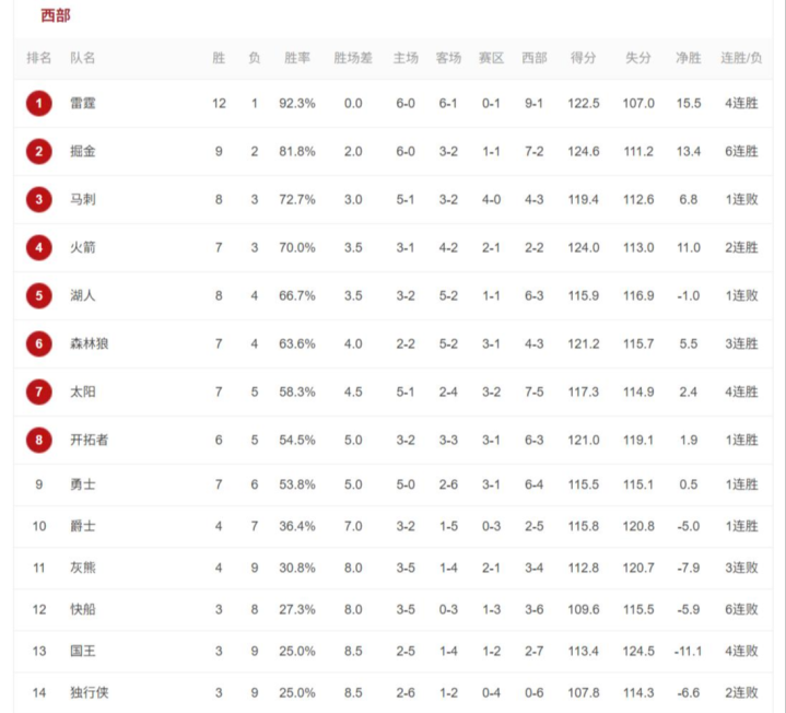 结束的其他比赛,太阳123-114力克独行侠,掘金130-116击败快船,老鹰133-100大胜国王,火箭135-112大胜奇才,雷霆队继续稳居西部第一,掘金反超马刺来到西部第二,火箭第四,湖人队暂列第五,勇士队第九,快船、国王、独行侠位列12到14位,目前西部常规赛的局势有没有符合球迷们预期呢?